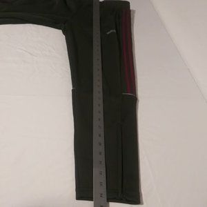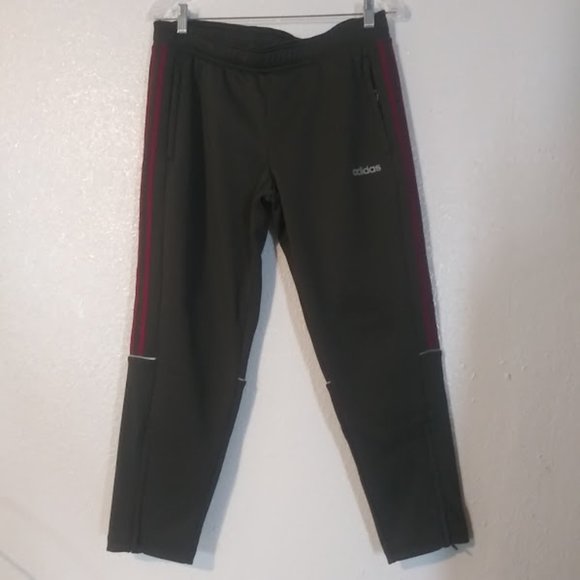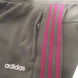 Adidas Aeroready sereno women's M dark gray slim tapered cut pants, 3 pink striped on the outer part of leg, zippered pockets, ankle zippers for fit, pull string on waist