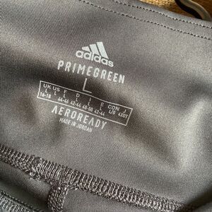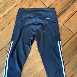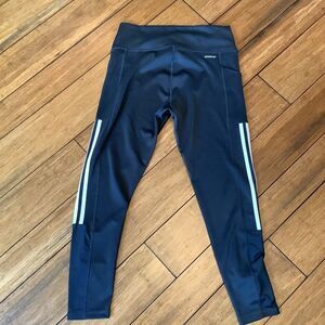 Off-black running tights with three white stripes and Adidas logo. Size large