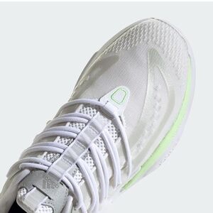 "Need a boost? These Adidas Alphaboost V1 in women's size 9 are ready to elevate your style and your stride. They're a perfect blend of crisp white, neon-lime pop, and eco-conscious design (made with Parley Ocean Plastic and recycled materials)—so you can look good while feeling good about where you step next. Say hello to comfort and goodbye to boring sneakers!"