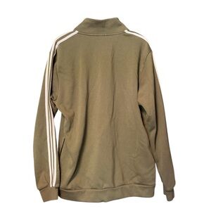 Adidas jacket in khaki green with white sleeve stripes. Full front zipper and high collar.