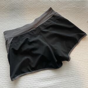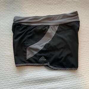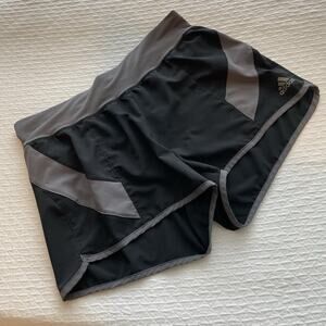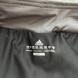 These Adidas athletic running shorts in size small feature an elastic waist with a drawstring closure for a secure fit during various sports activities. Made from polyester blended fabric, they are machine washable and suitable for activewear occasions. With a sleek black and gray color these shorts are perfect for workouts in the gym or outdoor summer sports like running, jogging, or volleyball. The athletic fit and compression area at the waist provide comfort and support for active women looking for versatile and sporty bottoms.