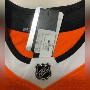 Adidas Authentic Philadelphia Flyers Home Jersey, Orange, size 54 (XL), Sean Couturier #14, professionally stitched numbers and lettering, tie down fighter’s strap sewed inside back of jersey. Adidas Climate Material. Item is new with tags and never worn. I ended up with another jersey and never returned this one. It’s been kept in closet storage since 2020 in a smoke free, pet free home. This was bought directly from the Wells Fargo Center Flyers Pro Shop.
