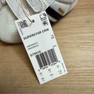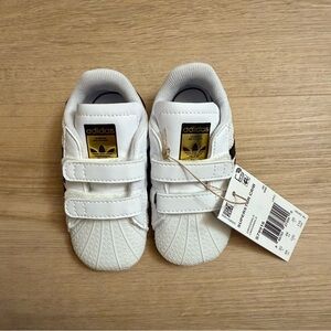 Comfortable Adidas sneakers with easy Velcro straps. Classic white with black stripes. Ideal for active kids.
