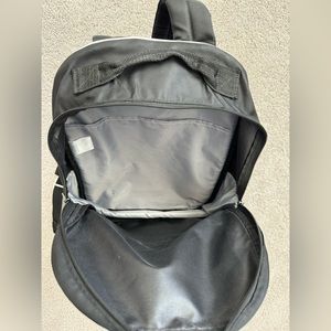 Used black backpack with laptop pocket. There are a few small ware marks on front but hard to notice.