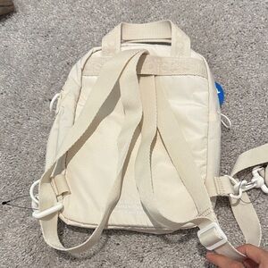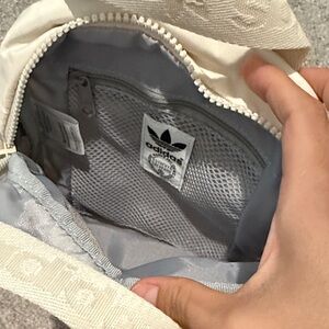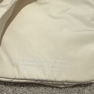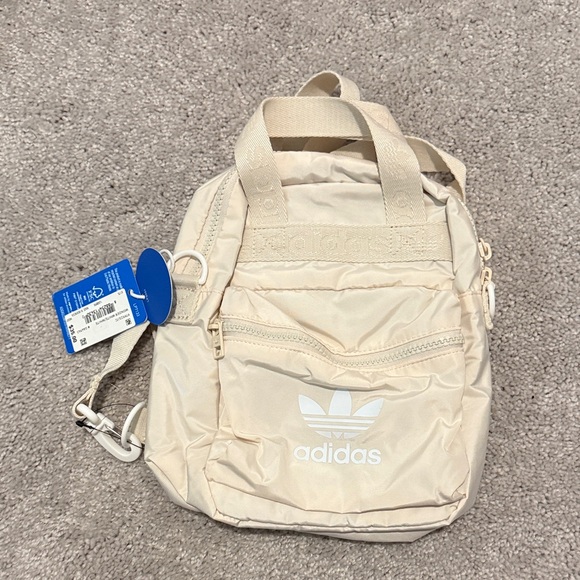 Compact Adidas backpack in beige. Includes front zipper pocket and adjustable straps.