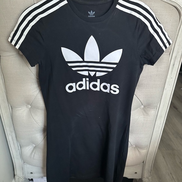 Stylish black dress with signature white Adidas logo and triple stripe design on shoulders.