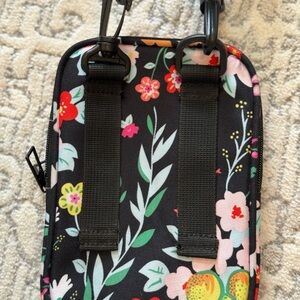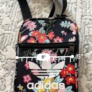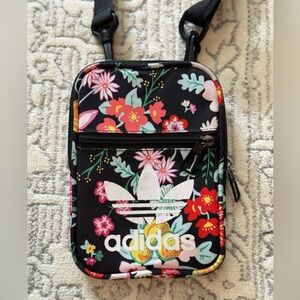 Compact Adidas bag with colorful floral print. Features adjustable strap and front zipper pocket.