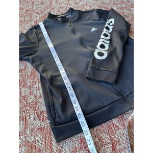 Adidas black full zip track jacket with iconic white logo on the left sleeve. This athletic jacket features a stand-up collar and ribbed cuffs and hem for a comfortable fit. Perfect for workouts, casual wear, or travel.