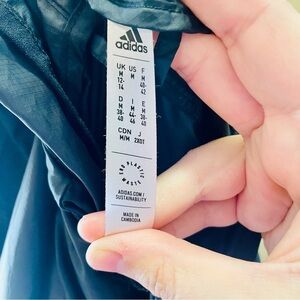 Stylish Adidas windbreaker in gray. Features a hood and front zipper. Iconic Adidas logo on front and back.