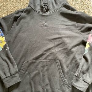 Black hoodie with colorful floral designs on sleeves. Features a front pocket and hood.