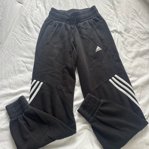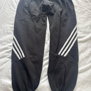Sleek black track pants with iconic white stripes. Elastic waistband for comfort. Perfect for casual wear.