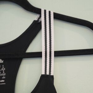 Sleek black racerback with Adidas logo. Features white elastic striped shoulder straps. Perfect for workouts.