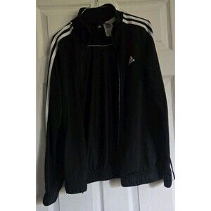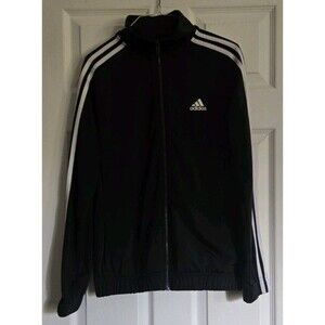 The Adidas Black White Classic 3 Stripe Track Jacket is a versatile and stylish activewear piece for women in size medium. This hoodless jacket features long sleeves, a full zip closure, and pockets for convenience. The black color with white stripes adds a sporty touch, perfect for traveling, casual outings, or even workwear. Made by Adidas, this lightweight jacket is machine washable and suitable for various activities such as gym training, track and field, or running. The classic track jacket style with a collared neckline and logo details make it a timeless addition to your wardrobe for the winter, fall, and spring seasons.