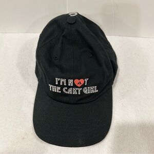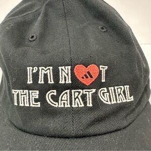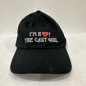 Classic black cap with “I’m not the cart girl” slogan on the front. One size fits most. Sustainable design. Adjustable sizing. 100% cotton. New and never worn