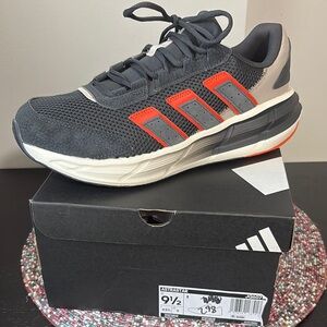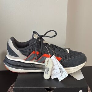 Sleek Adidas running shoes with a modern look. Features black mesh and red accents. New with tags and box 9.5 men 11 women