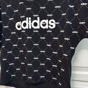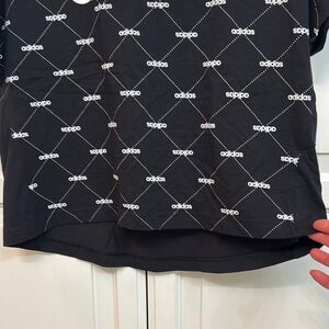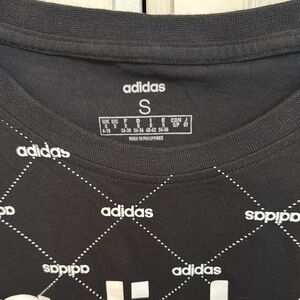 Sporty Adidas tee with a repeating logo pattern. Black base with white lettering. Size S. High low hem. Great condition.