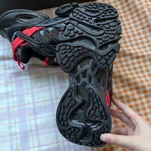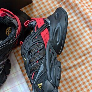 Brand new with box. These black, red, and gold chunky sneakers feature a complex and three-dimensional upper design, with a striking red and gold color scheme and the brand logo integrated throughout.