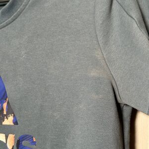 Tagged a women’s Medium (US 8–10), this dress-style tee is made in Cambodia with a soft, breathable fabric. The graphic shows some cracking and wear (see photo), and there's minor discoloration across the sleeves and chest as photographed—reflected in price.