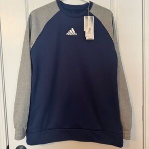 This Adidas sweatshirt features a deep navy blue body complemented by light gray sleeves, creating a stylish two-tone design. It has a crew neck style,long sleeves, and fleece lined making it perfect addition to your closet.