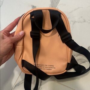 Compact Adidas backpack in blush pink. Features front zip pocket and adjustable black strap. Inside pockets and key ring. Excellent condition!