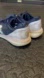 Gently worn. Majority has been indoor miles and tread is still clean and lots of miles to go. Very lightweight shoe. Mostly navy blue with white. Heel is a super pale pinkish white color.