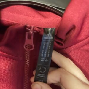 Burgundy Adidas track jacket with sleek design. Features classic logo on tag.