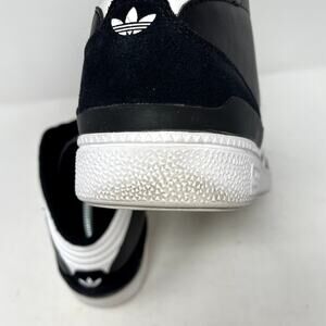 Black & white Busenitz Pro Mid sneakers by Adidas, men's size 9. Leather & suede, mid height shaft. Used condition with marks & wear as shown, especially at backs of heels, please see pictures.
