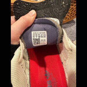 These haven't been worn a ton, but they are not new. I've tried to photograph any signs of wear. This one is "bliss," not to be confused with the shoe that came out later in "cloud white". So it's a darker white, all suede, maybe somewhere between off white and extremely light grey, as opposed to a bright white.