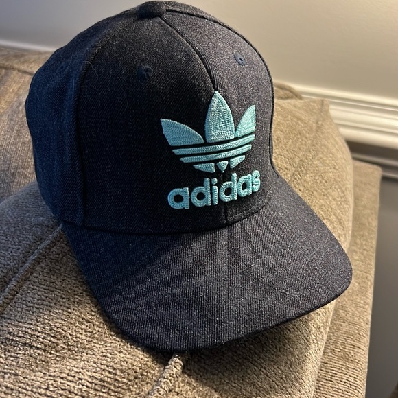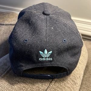 Adidas ball cap, grey with aqua blue trefoil embroidered logo. Never worn. Perfect shape.