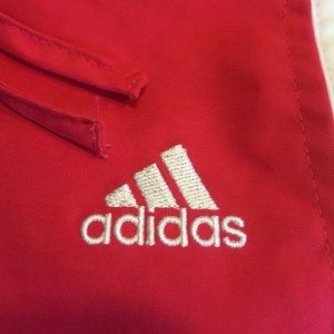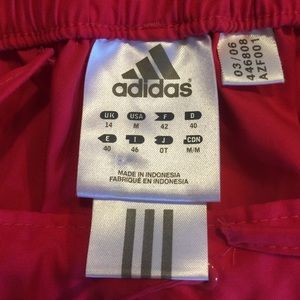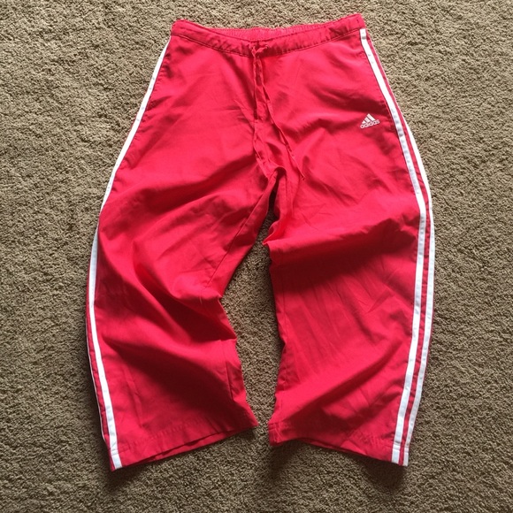 Bright pink Adidas sport capris very clean white stripes down both legs. They have pockets and a draw string with elastic on the back for a perfect fit. Size medium fits an 8.