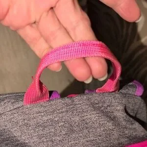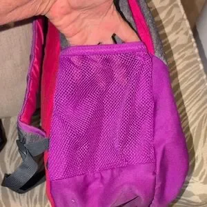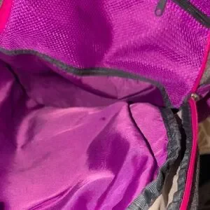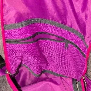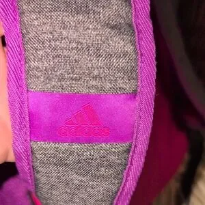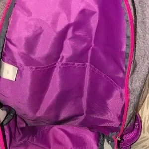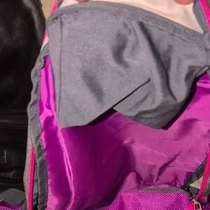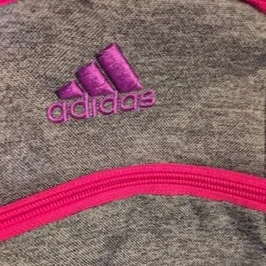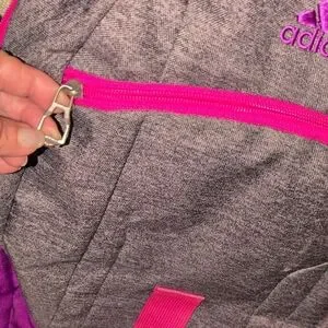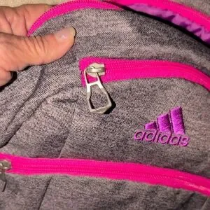 Adidas gray computer bag , athletic backpack with vibrant pink and purple accents. Features spacious compartments and durable design. 2 large compartments for lots of books, clothes, shoes and a computer. multiple zipper compartments on the outside front of the bag. Sides have mesh pockets to hold water bottles. adjustable padded straps to protect your back and shoulder .