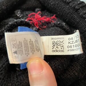 Stay cozy and stylish with this Adidas hat, featuring a classic black and red color scheme. The pom-pom on top adds a playful touch, while the knit design ensures warmth and comfort. Perfect for accessorizing your winter wardrobe.