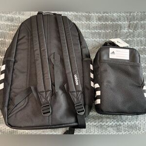 This listing is for a NWT's set of Adidas Classic 3-Stripes 5 Backpack and Santiago 3 Lunch Bag in black/white.