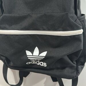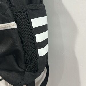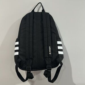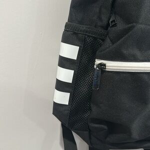 Sleek Adidas backpack with iconic logo. Features bold black design with white accents. Ideal for everyday use.
