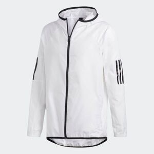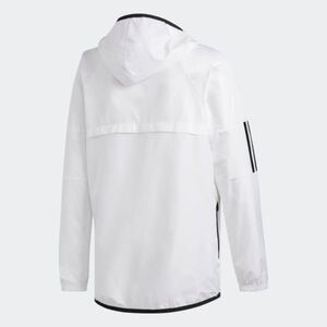 For days when the wind won't let up and neither will you. This lightweight jacket keeps out the chill on game days with a streamlined build. It has an elongated back hem, a high neck and a drawcord-adjustable hood for extra coverage. Contrast 3-Stripes pop off the elbows. Trendy, versatile, and comfy rain & wind jacket that is great for casual everyday wear.