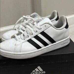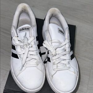 Timeless Adidas sneakers in white with iconic black stripes. Ideal for everyday style.