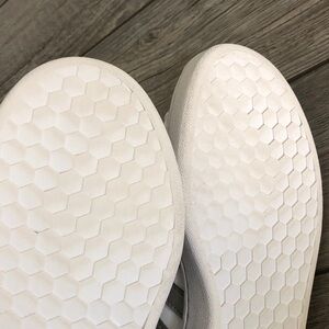 Excellent preloved condition. Women’s size 9.5 white Adidas sneakers with classic gray stripes