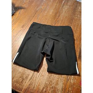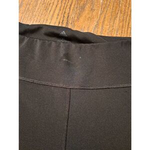 Good used condition Adidas ClimaLite womens size XL black Capri length leggings with 3 white stripes and a small inner pocket. These leggings feature a comfortable stretch fit and moisture-wicking fabric for active wear. Capri leggings offer versatile style for workouts, casual wear, and athleisure outfits. Measurements taken while item was laid flat, not stretched, and are approximate; may vary slightly due to hand measuring. Waist approx 16", rise approx 12", inseam approx 23–23.5", ankle opening approx 4.5–5". One small spot visible in pictures. Color hue might vary depending on lighting conditions.