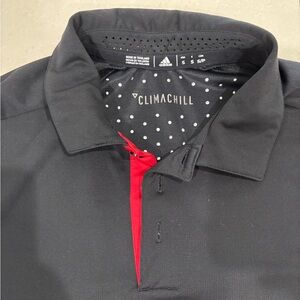 Sleek black Adidas Climachill polo. Features bold red accent. Ideal for active wear.