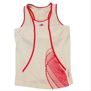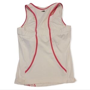 Great quality with an attached white sport bra for support. In white with hot pink graphics. 91% nylon. 9% Spandex 14" flat chest measurement. 21.5" long Great condition from my own closet. There is a matching tennis skirt and top for sale too. Bundle them!!