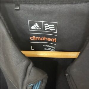Adidas Climaheat warm up jacket with San Jose Sharks hockey emblem. Size Large. Nice warm up jacket with a 1/4 zipper and a zipper garage. The sleeves are a waffle pattern. This item looks to have hardly been worn. Size large,
