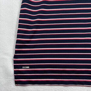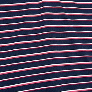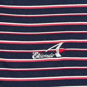 Adidas Climalite. Golf Polo. Navy with red and white stripes. Eldorado embroidered on left chest. Short Sleeves w/ collar and 3 button closure.