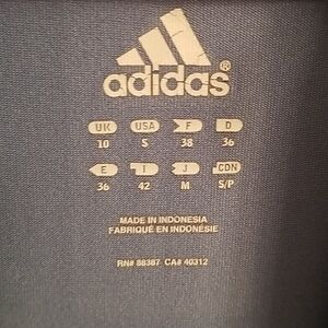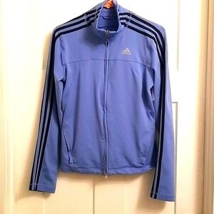 Adidas Climalite track jacket with full zip closure. Light blue with dark navy stripes. Features side zip pockets and an interior zip pocket.