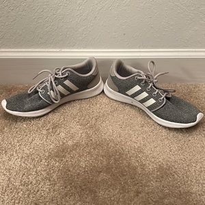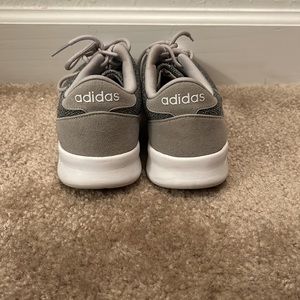 Gray and white adidas running shoes. Cloudfoam, very squishy inside for feet