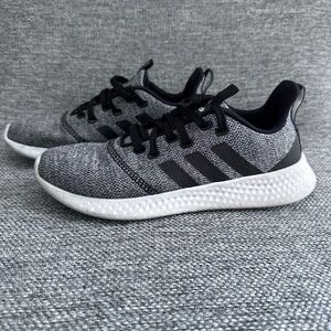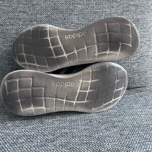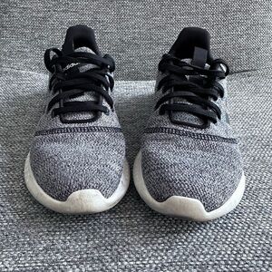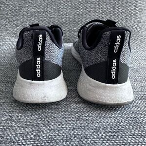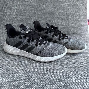 Sleek Adidas sneakers with a knit design. Features black stripes and a cushioned white sole.