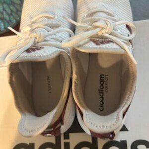 Lightly worn and in excellent condition! These stylish Adidas Cloudfoam Pure SPW sneakers feature a clean white upper with burgundy accents for a sporty-chic look. Super comfy with Cloudfoam cushioning—perfect for casual wear or light workouts. Size 7.5 Medium. Comes with the original Adidas box.