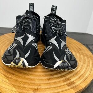 Elevate your sneaker game with the Adidas Consortium JUICE X NMD Black Silver Racer. This sleek sneaker boasts a mid-top shoe shaft style and a black and silver colorway that adds a touch of sophistication to any outfit. The Primeknit upper material and M shoe width ensure a comfortable fit, while the adidas NMD product line guarantees top-notch quality. Perfect for any athletic occasion, the adidas NMD Racer is designed for men and features a US size 8. The shoe is customized to provide excellent performance without compromising on style. The Style Code DB1777 and Model adidas NMD Racer are testaments to the brand's commitment to creating premium athletic footwear. Bid with confidence on this limited edition sneaker that is sure to make a statement.
