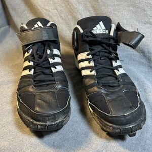 The Adidas Corner Blitz 8 MD Mid Football Cleats in size 12 are pre-owned cleats designed specifically for football. These cleats feature a molded sole for traction and stability on the field. The cleats are black in color and are designed by the popular sports brand adidas, known for their high-quality athletic gear. The model number of these cleats is 902207, making them easy to identify for those in need of this specific style. Perfect for any football player looking for a reliable and durable pair of cleats.