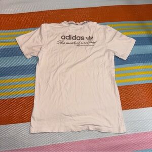 Soft cream Adidas tee. Features iconic logo on collar. Casual and versatile.