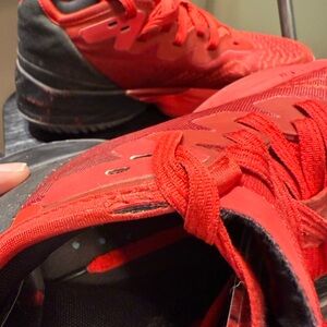 Vibrant red athletic sneakers with black accents. Stylish and comfortable for sports or casual wear. In well loved condition. See pics for wear